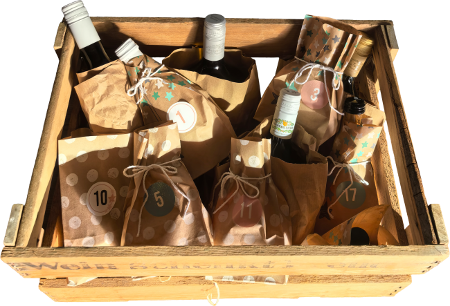 Dich erwarten 24 + 1 Überraschungen, liebevoll zusammengestellt mit Weinspezialitäten und Genussmomenten aus unserem Weingut.